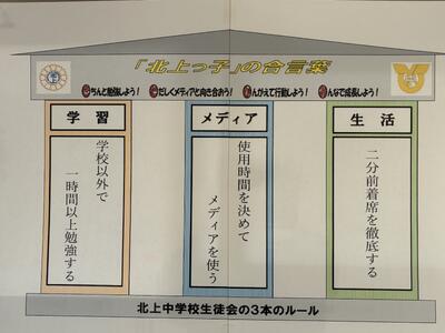 4 北上中学校では、北上小と一緒に考えた「北上っ子」の合言葉として、①学習「学校以外で1時間以上勉強