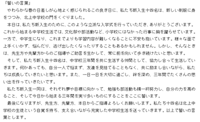 入学式の最後に、新入生を代表して、「入学生 誓いの言葉」がありました。
